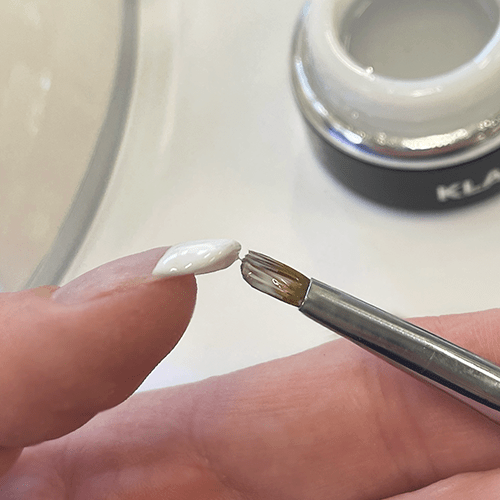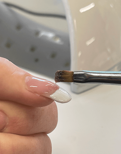 Så fort det hvite er på plass og herdet ferdig kan du legge dekkende gel fra neglebåndene og ut mot det hvite. Hent opp en dråpe gel med penselen. Du begynner ved neglebåndet og jevner det ut i små buer ut mot tuppen.