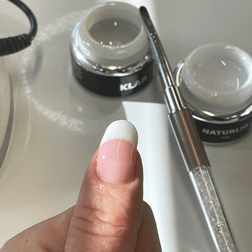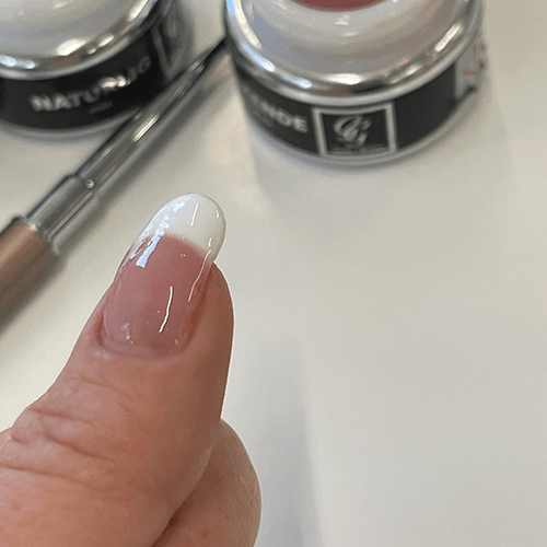Blir neglen eller overgangen mellom rosa og hvit ujevn kan det files eller jevnes ut med ett lag med klar gel.