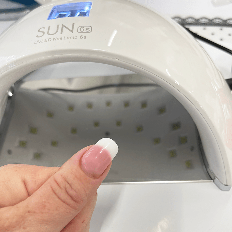 Ønsker du en dekkende hvit farge kan du legge flere tynne lag. Herd neglen 2 minutter mellom hvert lag.