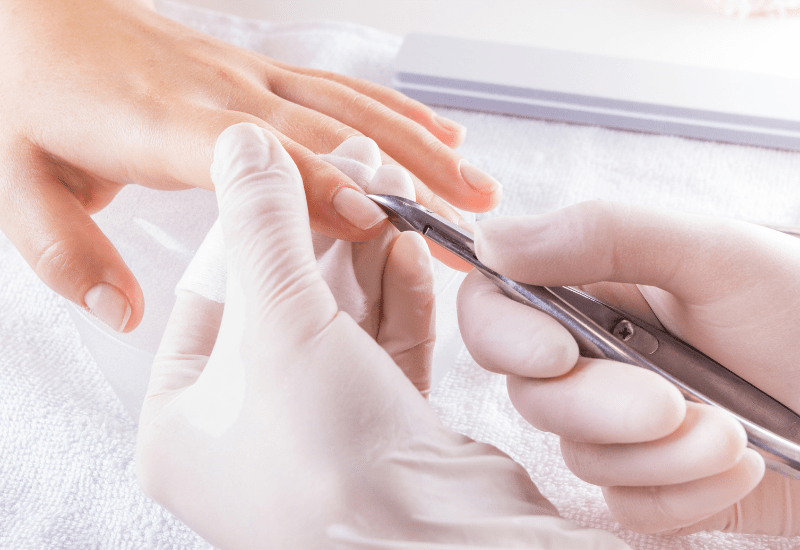 Vi kan anbefale en neglebåndsmykner (Cuticle Remover) for å mykne opp neglebåndet. Bruk så en neglebåndsskyver for å forsiktig skyve neglebåndet av negleplaten med en liten sirkulær bevegelse. Noen velger også å bruke manikyrpinner til dette, men det er smak og behag. Pass på at du ikke skyver for hardt eller for langt tilbake. Etter dette kan du forsiktig klemme av den døde huden som er synlig med negletang (eventuelt skjære med en neglebåndskniv), men her er det også viktig å være forsiktig. Du vil bare fjerne den døde huden som er hvit i fargen, og ikke huden din. Når du bruker neglebåndstang må du være forsiktig og ikke dra i huden, klem og klipp i en bevegelse.