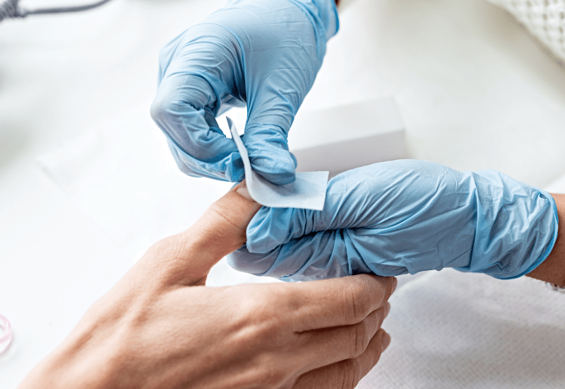 Neglebåndet er den døde huden som fester seg ved bunnen av neglen, og den må skyves tilstrekkelig tilbake og fjernes fra negleplaten slik at produktet kan feste seg ordentlig. Havner produktet over eller inntil neglebåndet kan vi nesten garantere at du vil få tidlig lifting.