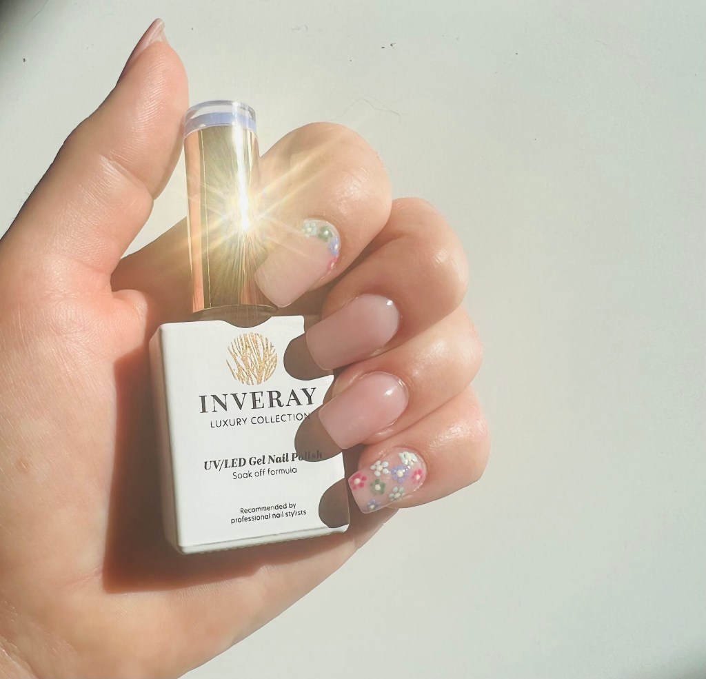 Du trenger en skål, dotting pen og lakk. Vi har valgt å bruke INVERAY gellakk men du kan også bruke vanlig neglelakk. Vi har herdet underveis så ikke fargene sklir i hverandre. Uansett hvilken lakk du velger er det viktig å avslutte med topcoat for å beskytte design og bevare fargene.