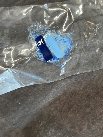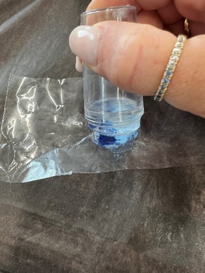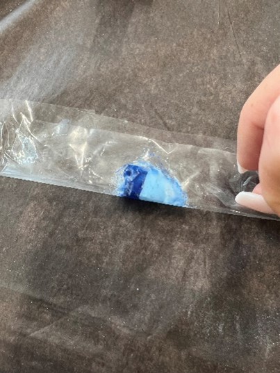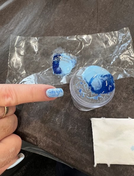 Finn frem plast biten, noe tykkere enn plast film. Velg en farge i tillegg til basis fargen. Legg en stripe av hver av fargene inntil hverandre på plasten. Brett arket og press litt ned så fargene blir spredt tynt. Finn frem stempel pute, press den ned på fargene på plasten så på neglen. Kan gjentas hvis man ønsker mer farge. Vi anbefaler en negl av gangen så lakken ikke siger før man herder. VIKTIG – å fjerne lakk fra hud og neglebånd med cleaner før man herder for å unngå lifting. Kommer det gellakk på utsiden av neglen vil det gi en luft lomme som vil løsne fra huden og det kan komme inn bakterier og smuss. Avslutt med å herde ett strøk topcoat for å beskytte designet.