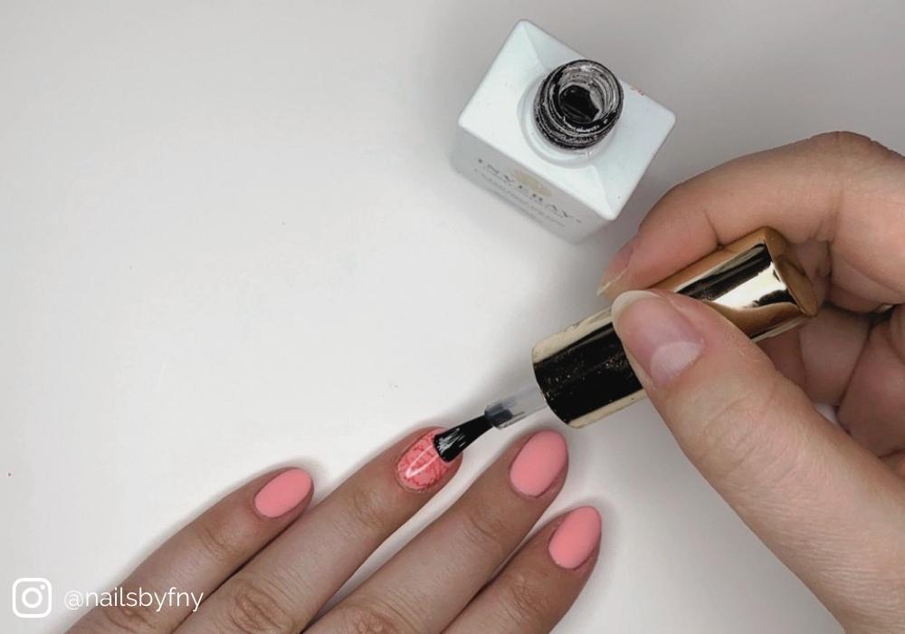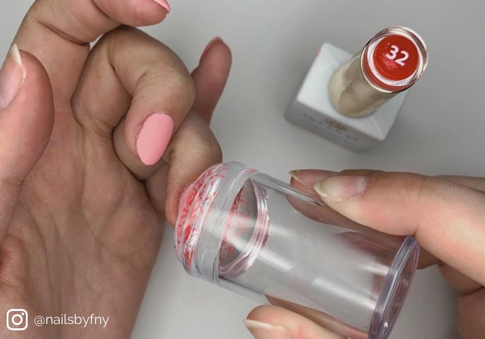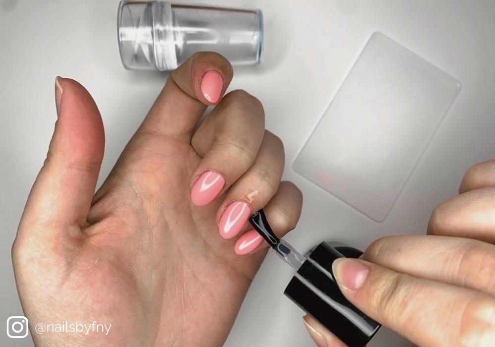 Press så stempelputen ned på mønsteret og trykk det ned på neglen. Når mønsteret har tørket kan man bruke en vanlig klar lakk for å beskytte designet for slitasje i hverdagen, og få en ekstra glans. Har man valgt å påføre dette på gel, akryl eller gellack kan man fint påføre en top coat og herde etter eget ønske.