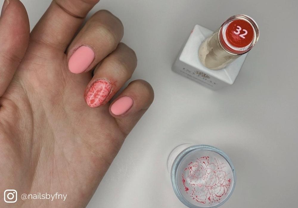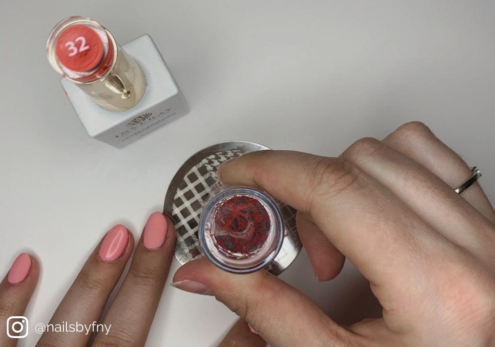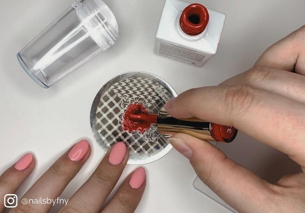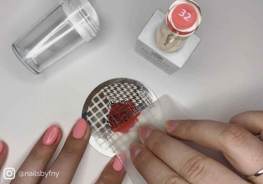 Gjør klar stempelplaten, og velg deg fargen du vil at mønsteret skal ha. Påfør ett lag med neglelakk på platen. Ta skrapen og dra over den overflødige lakken.